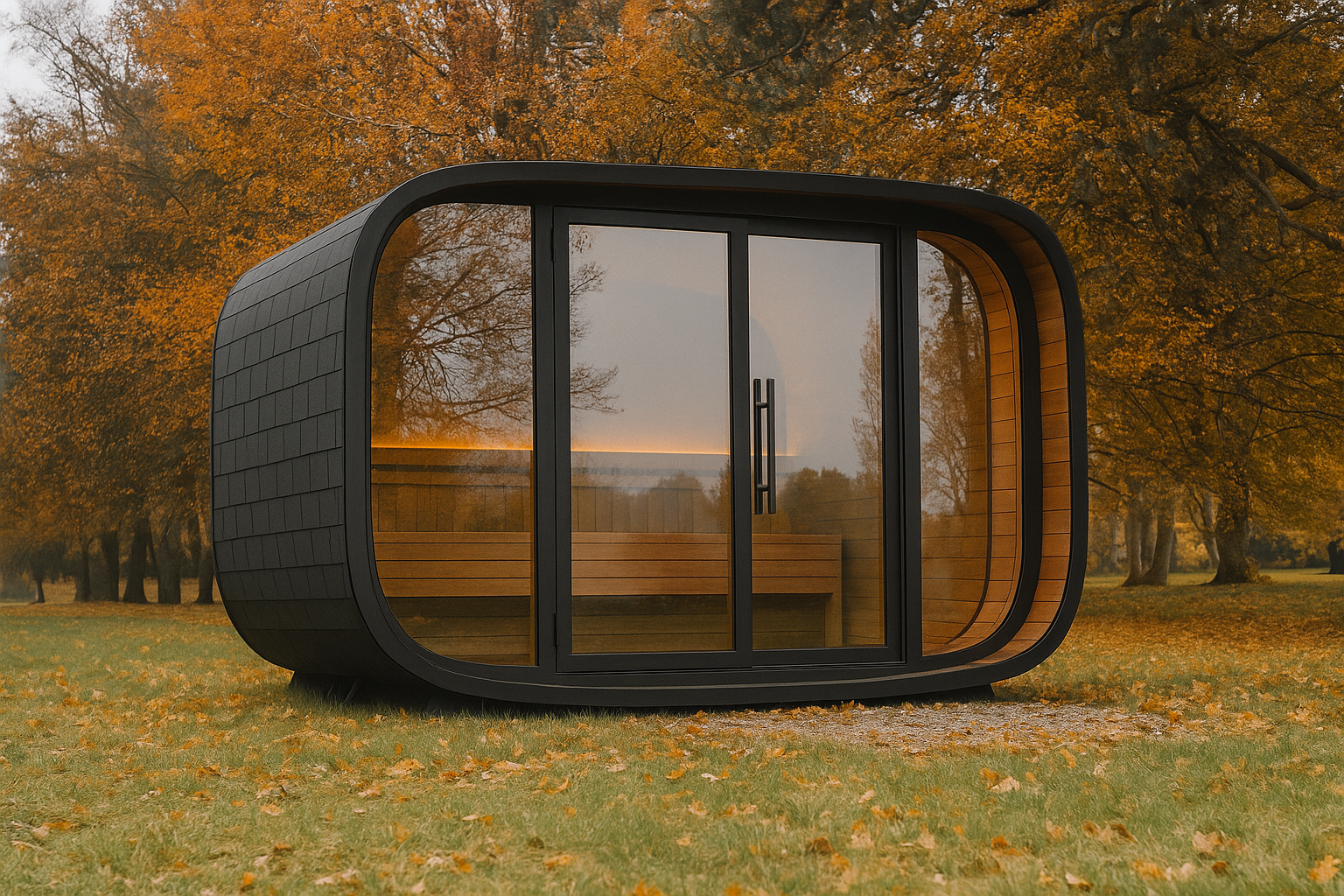 A modern outdoor sauna designed for relaxation, combining natural wood aesthetics with powerful heating for a spa-like experience in your backyard.