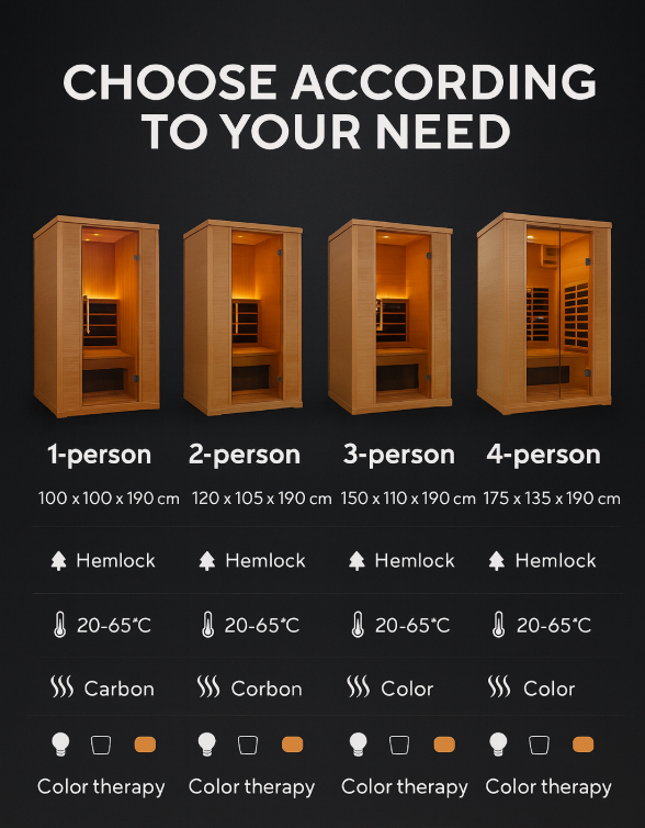 Step into pure relaxation with our premium infrared saunas — crafted from natural Canadian Hemlock wood and powered by advanced FAR infrared technology. Designed for health, comfort, and energy efficiency, each sauna brings you detox, stress relief, and daily balance — right in your own home.
